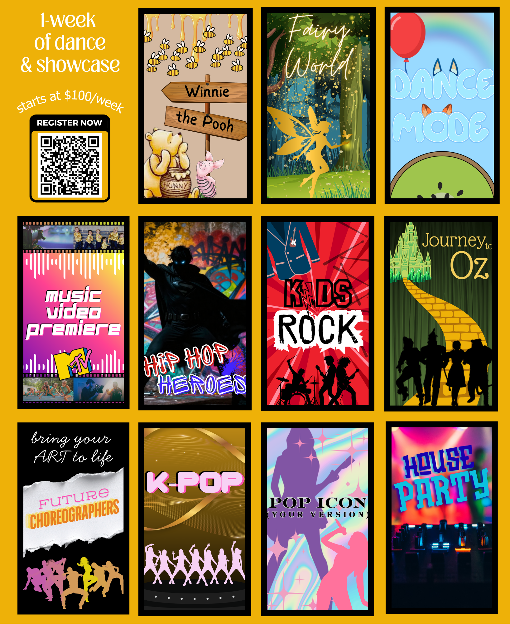 All of our summer dance workshops are schedule for Monday through Friday of the noted week. Each workshop will culminate in a free showcase for family and friends at the end of the week.